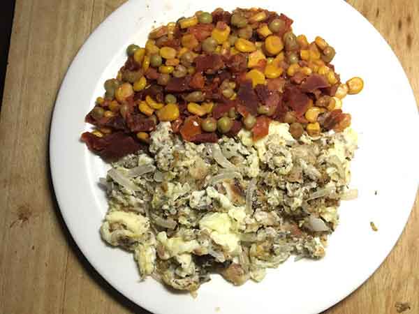 Also add little water to your pan and add the eggs like you are frying with water. Add other vegetables and allow to steam. When it is ready, you add drops of olive oil and turn off the heat. Afterwards, serve it.